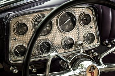 When Muntz purchased the assets of the Kurtis Company in 1950, he also got Frank Kurtis' genius in the deal. Muntz, Kurtis and race car driver Sam Hanks put their heads together to redesign the car to give it a broader base of appeal to the buying public. During this time 29 two-passenger cars were produced from aluminum. They were basically unchanged from the Cadillac powered Kurtis’ except for the gadgets Muntz added. Muntz, along with Mike Shore, used their advertising genius to promote the car way beyond its prominence. A 1950 road test of the Muntz Jet published in Sports Cars magazine had this to say about the "Road Jet": "When we test-drove car #6 we used a stopwatch for the pickup figures. Example: 0 - 80 in 9 seconds. On the turnpike, 125 with something left in foot. The car rides well, corners well and stays on an even-keel. The finish is high-quality throughout and the instrument panel has everything by way of dials. After the initial 29 were built, the company moved to Evanston, Illinois where Muntz, Hanks, and Kurtis unveiled their "new improved" model. They lengthened the car 13 inches to accept a rear seat, thus the first "sports car" which would seat 4. Because of typical General Motors arrogance towards small auto companies, Muntz was unable to sell his car with the Cadillac engine unless he disguised it. Luckily, Muntz had a special relationship with Benson Ford and was not only able to buy parts from Ford, but Ford also agreed to allow new Muntz cars to be serviced by local Ford Dealers. The revamped Muntz now came with a flathead Lincoln engine and "Lincomatic" transmission as well as Ford suspension, windows and many other items. Muntz might have had an in with Ford since he gave Ford a new Muntz! It was rumored that Ford got a lot of ideas from that Muntz for their upcoming sports car, the Thunderbird. Many of the other innovations Muntz placed on his car were unheard of in the American auto industry at that time. Each car was equipped with a padded dash board and seat belts (unfortunately affixed to the seat!). Survivors of the company say that, "The seat belts were strictly a gimmick, since if you were going to name a car a jet, you better have seat belts." Muntz had a few innovations of his own. He invented a console between the front seats and placed a Motorola radio in it. He actually affixed the speakers in both kick panels.