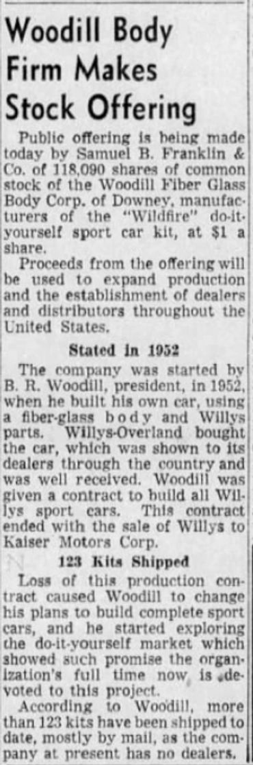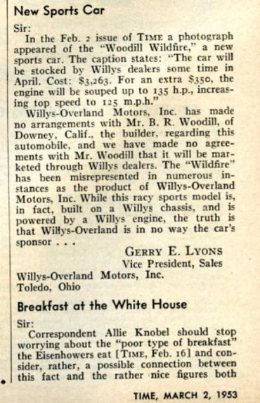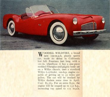 Upon his return to Southern California, Woody, the eternal optimist, jumped the gun and issued press releases stating the Wildfire was to be the Willys Wildfire. Unfortunately, several months later Willys Overland went into receivership and was subsequently merged into Kaiser Frazer Corp. Since K-F already had made arrangements with Howard "Dutch" Darrin to build his sliding door, sports car, there was no need for a second. Willys issued a retraction to Woodys statements, and the Willys Wildfire was history.
