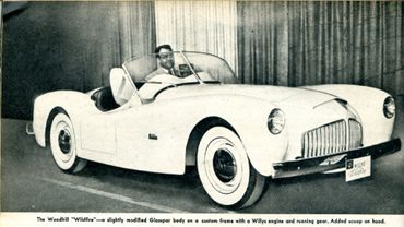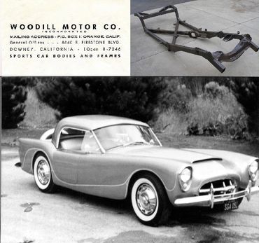 The early 1950's saw the young B.R. (Robert) "Woody" Woodill become one of the most successful Dodge dealers in the nation. Following in his father's footsteps, Woody was able, in fact, to make his business so successful that he was allowed to add the Willys line, an almost unheard of move in the 50's. One thing that Woody had always wanted to drive as his own personal mode of transportation was a sports car. The sleek lines of the new Jaguar XK 120 had caught his fancy. He expressed his wishes to his mechanics at the dealership. The unanimous retort from those mechanics was to think again, as they felt the Jag to be a rather unreliable car and definitely hard to get parts for it. "Woody, she will be in the shop more than you'll be driving her," was the advice his chief mechanic gave him. He went on to say, "Too bad America hasn't made a real sports car yet. It would be so much easier to maintain." That evening Woody was relaying his problem to his over the fence neighbor, Howard Miller. Howard was very talented at making almost anything. "Why not build your own sports car using all American running gear?" Howard suggested.